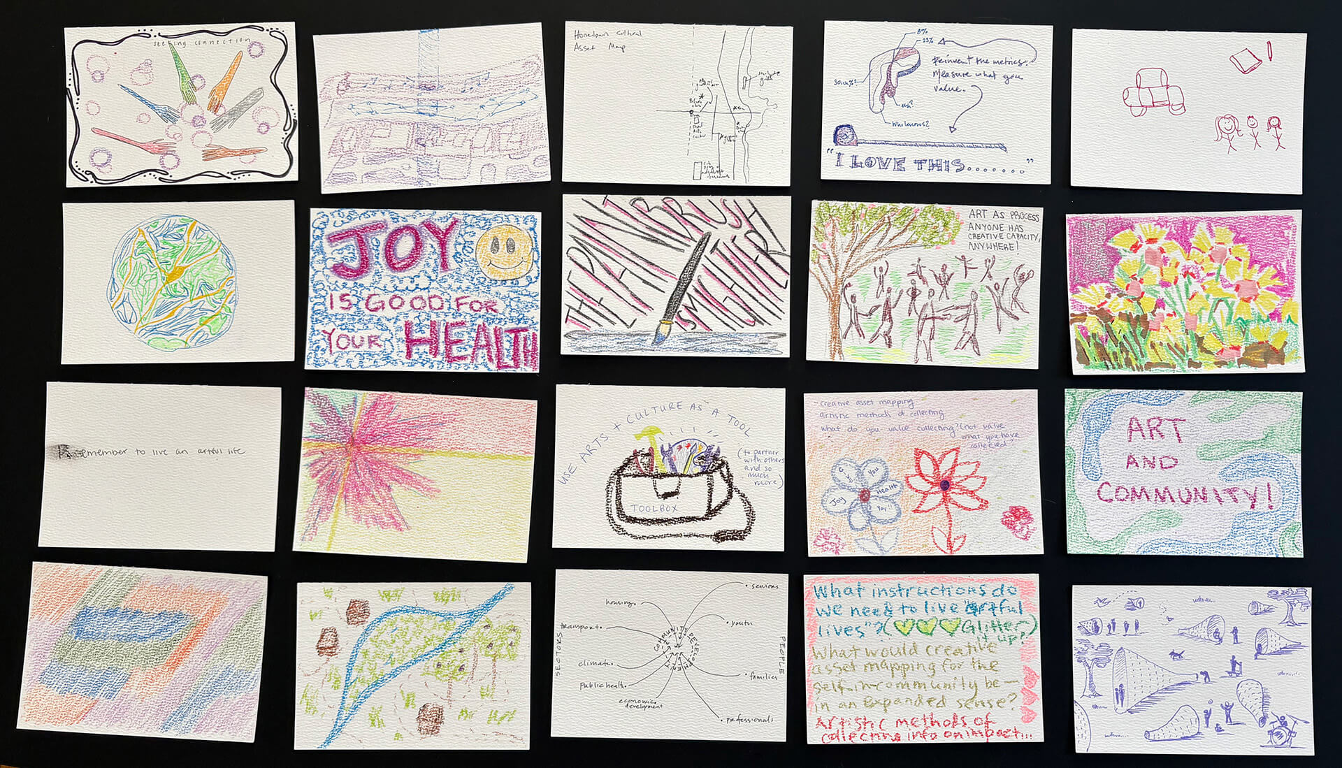 We ended as we began: with joyful artmaking, this time with the entire class participating. With blank postcards and colored pencils, we sketched images and wrote notes to our future selves, recentering our work on words like love, community, art, joy, connection. We left the room with a hope (and a few seeds planted)—that future leaders shaping our communities might better understand the ways in which artists and cultural institutions can be engaged to build more inclusive, equitable, healthy places.